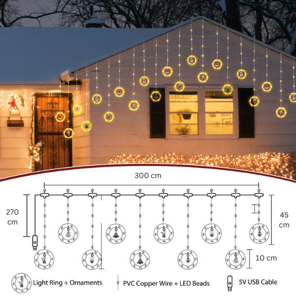 Delikatnie mieniące się światła, starannie umieszczone w przezroczystych pierścieniach, generują czarującą atmosferę, rzucając promienny blask na zawieszone figurki.