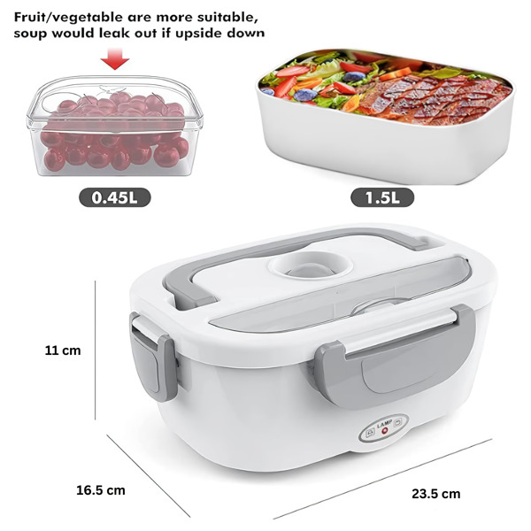 Ten podgrzewany pojemnik na lunch zawiera dwa wyjmowane pojemniki o pojemności 1,5 l i plastikowy pojemnik o pojemności 0,45 l, których można używać zamiennie.
